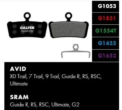 Podrobné údaje o výrobku: - Kompatibilita: Určené pro kotoučové brzdy (specifikace kompatibilních modelů na vyžádání). - Materiál třecí plochy: Pokročilá směs Galfer – optimalizovaný brzdný výkon a odolnost vůči přehřívání. - Použití: Horské kolo (MTB), trail, enduro, náročné terény. - Vlastnosti: Nízký hluk, dlouhá životnost, stabilní brzdný výkon.