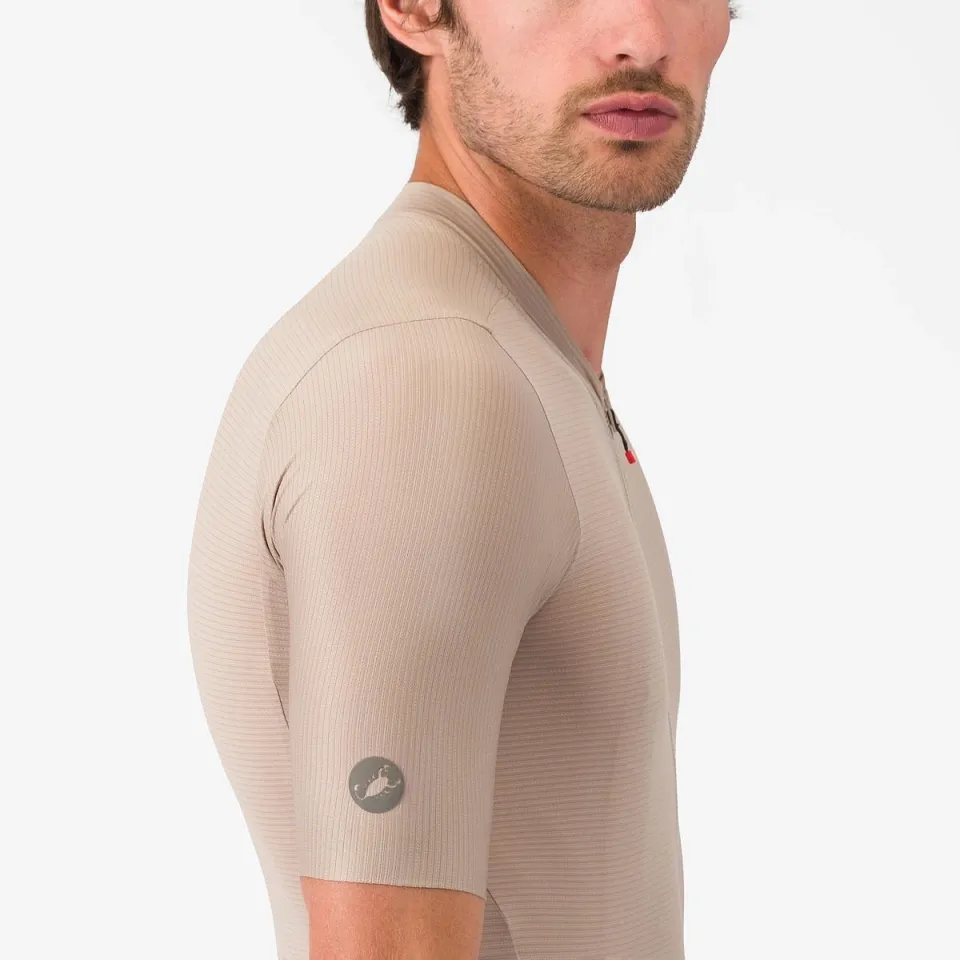 Tkanina Air_O Stretch: Vyvinuta exkluzivně pro Castelli. Nabízí výjimečnou pružnost ve všech směrech, což umožňuje dresu perfektně kopírovat postavu bez nepříjemného pnutí v oblasti ramen a hrudníku.