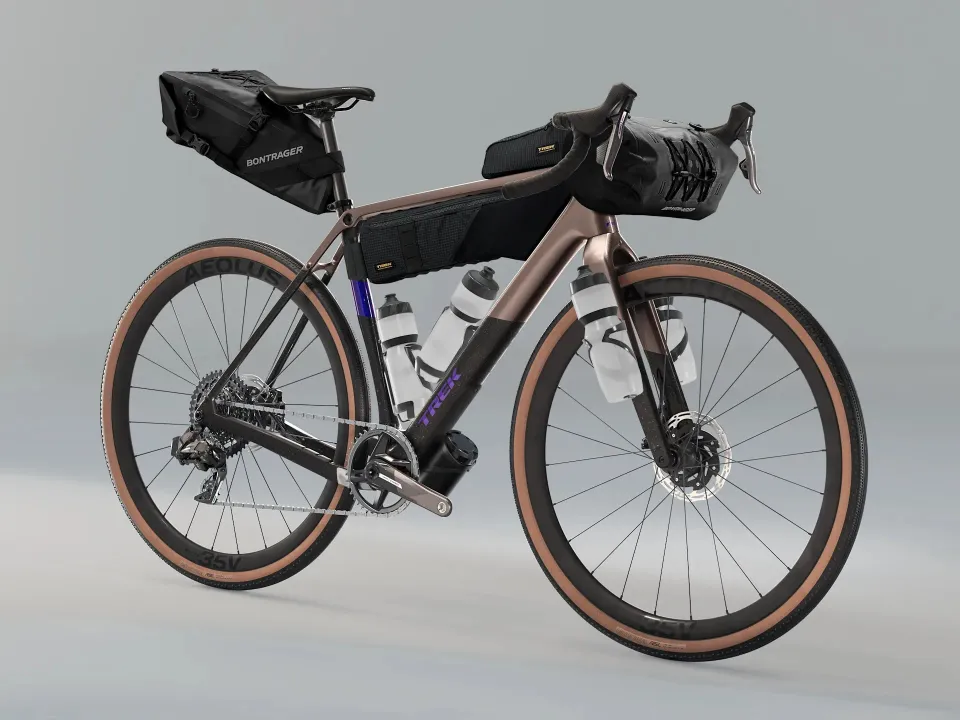 Rám z karbonu OCLV řady 500 s karbonovou vidlicí, vnitřním úložným prostorem ve spodní rámové trubce, místem pro 50mm pláště (naměřeno) a úchyty na rámu a vidlici. 12rychlostní zcela bezdrátový pohon 1x SRAM Force XPLR AXS, hydraulické kotoučové brzdy, karbonová sedlovka a kola Bontrager Aeolus Elite 35V se 42mm plášti připravená na bezdušovou verzi.