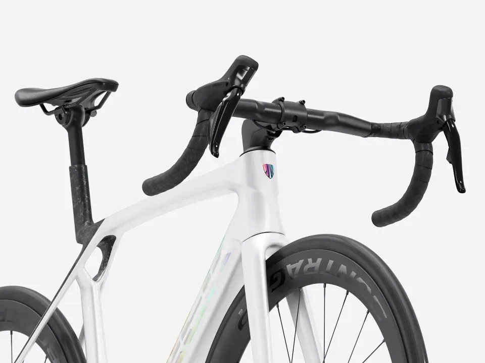 Madone Gen 8 je v pákách užší než v obloucích, takže lze rovnou za jízdy upravit pozici a maximalizovat aerodynamiku nebo výkon. Dvoudílný design umožňuje rychle a snadno vše vyladit.