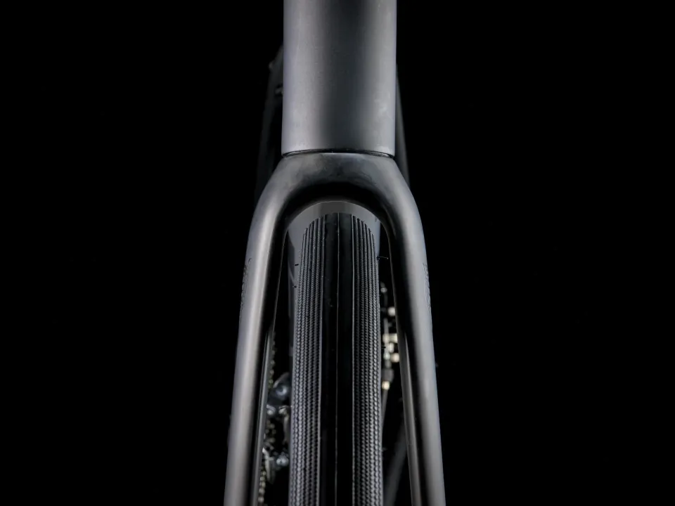 Domane AL, celokarbonová vidlice, kónický karbonový sloupek, vnitřní vedení brzd, úchyty na blatníky, flat mount uchycení kotoučových brzd, pevná osa 12x100 mm