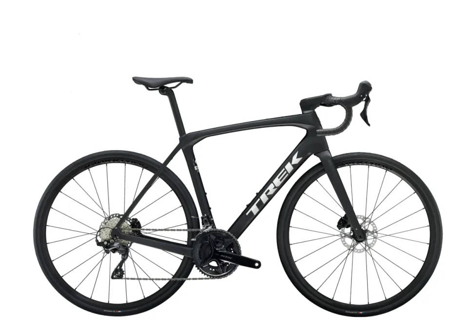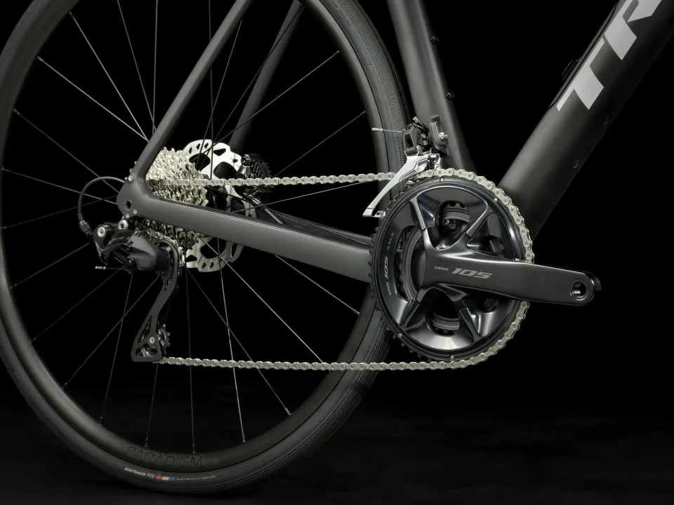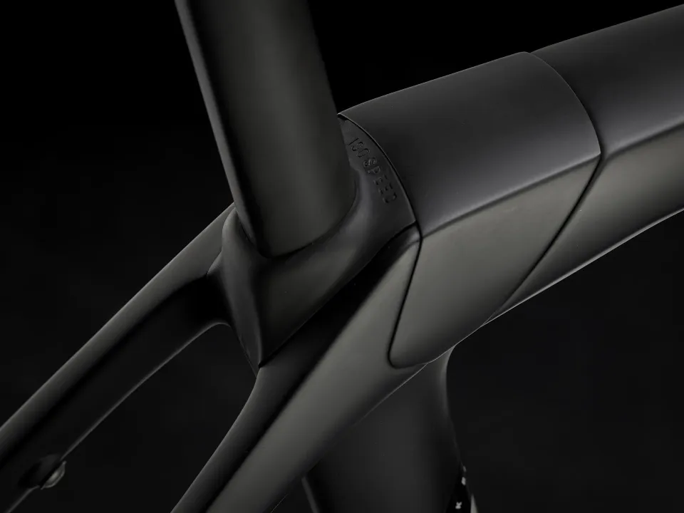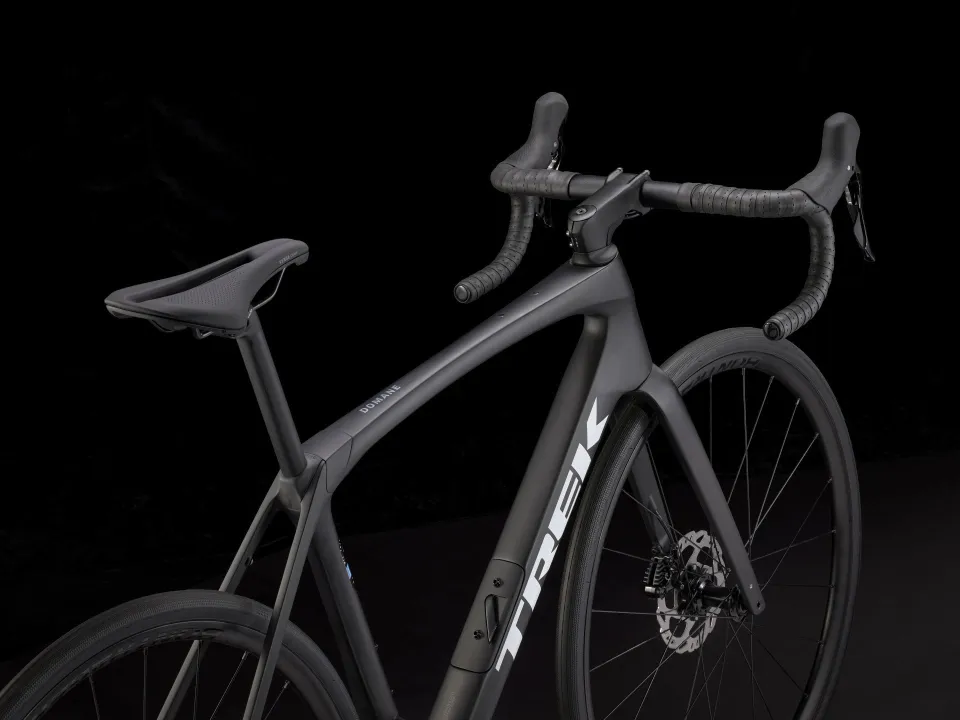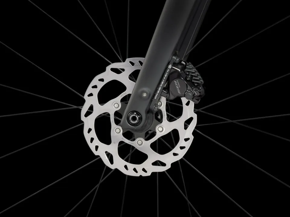 Domane SL karbon, kónický karbonový sloupek, vnitřní vedení brzdových lanek, úchyty na blatníky, kotouč s úchytem Flat Mount, pevná osa 12 x 100 mm