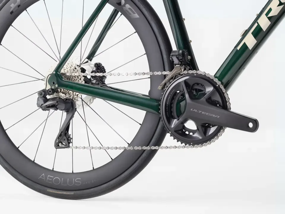 Mimořádně lehký propracovaný rám a vidlice z karbonu OCLV řady 800, zadní prvek IsoSpeed, integrovaný vnitřní úložný prostor a úchyty na horní rámové trubce. Kolo je vybaveno bezdrátovým elektronickým pohonem 2x12 SRAM Force AXS E1, klikami s wattmetrem pro sledování výkonu, účinnými kotoučovými brzdami s úchytem Flat Mount, karbonovými koly Aeolus Pro 51 a řídítky Bontrager Aero Pro IsoCore tlumícími vibrace o 20 % víc než standardní karbonová řídítka.