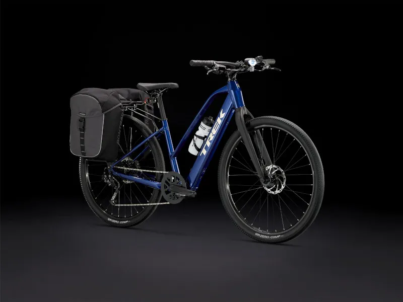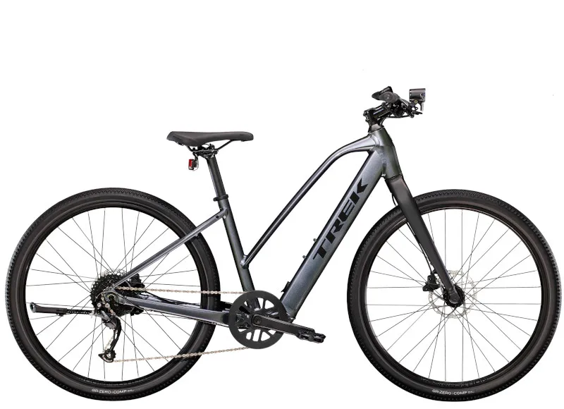 Lehký hliníkový rám se sníženou rámovou trubkou, díky níž je nasednutí i sesednutí ještě snazší, patentovaný systém podpory šlapání Trek s motorem v náboji (250 W, 40 Nm), který poskytuje podporu až do rychlosti 25 km/h, a 250Wh baterie pro dojezd až 55 kilometrů na jedno nabití. Tuhá kola 650b, široké pláště 50c pro výkon a pohodlí na různých površích, spolehlivý 9rychlostní pohon Shimano, hydraulické kotoučové brzdy, integrovaná světla napájená z baterie a stojánek.