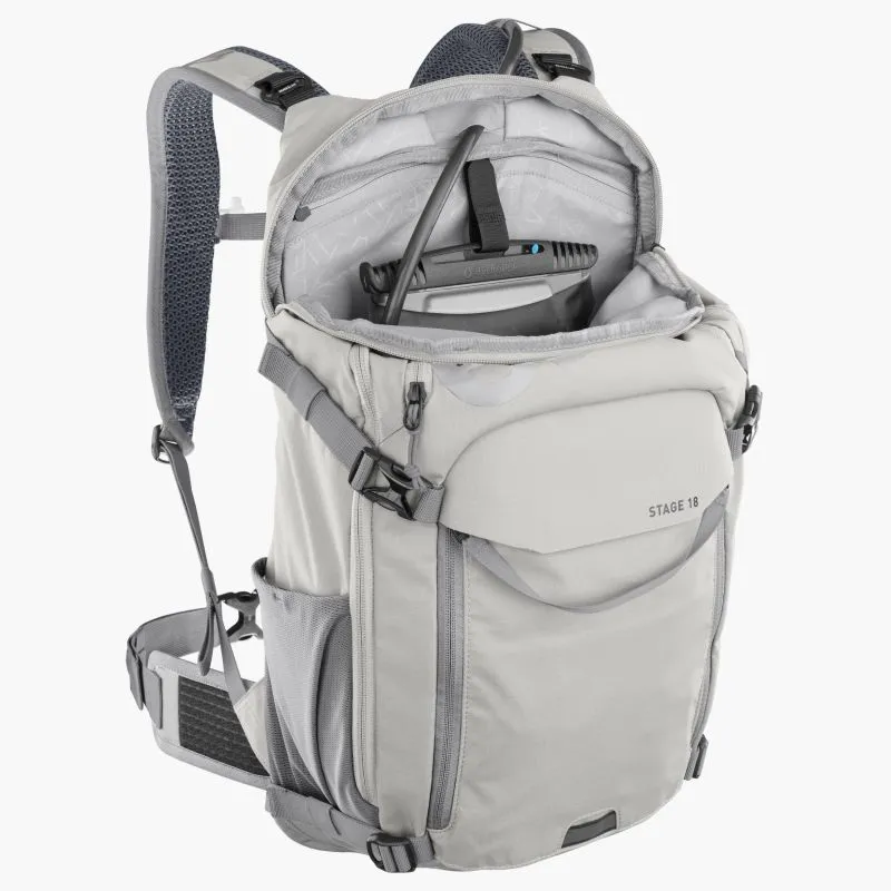 Model Evoc Stage 18l je multifunkční batoh vyzbrojený mnoha skvělými vlastnostmi. Pokud rád jezdíte s plnou výbavou, ale nedáte dopustit na komfort při jízdě, je Stage přesně pro vás! Speciální vychytávkou na této řadě je BRACE LINK na horní části popruhů u ramen. Díky této technologii se popruhy automaticky přizpůsobí šířce vašich ramen a zajistí maximální komfort i při delší jízdě díky optimální distribuci váhy.