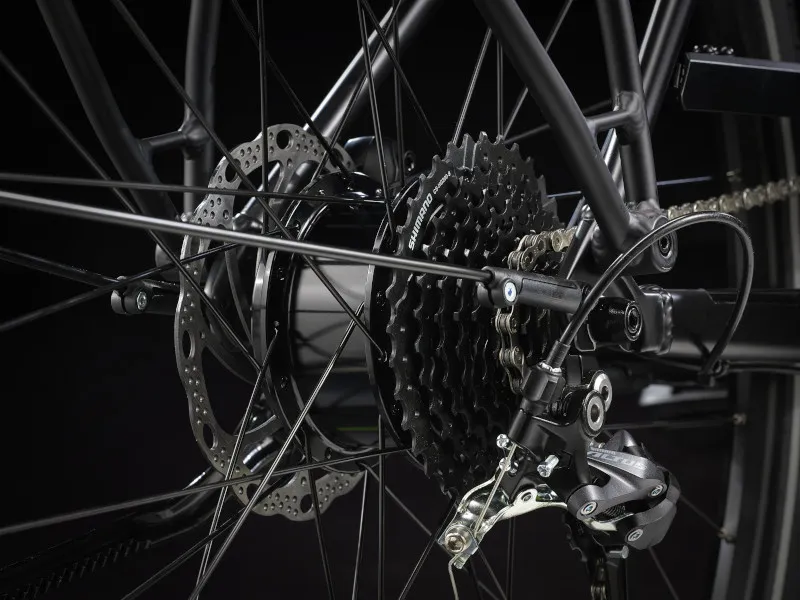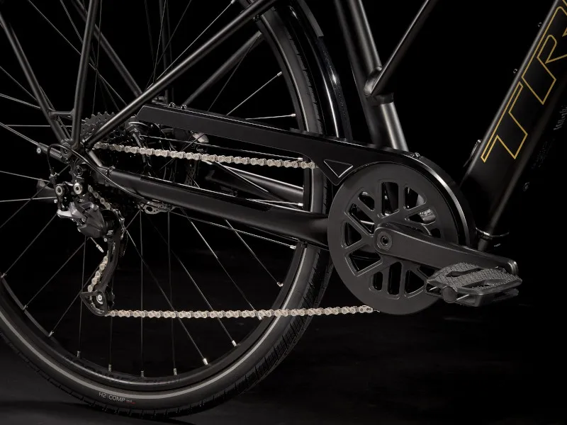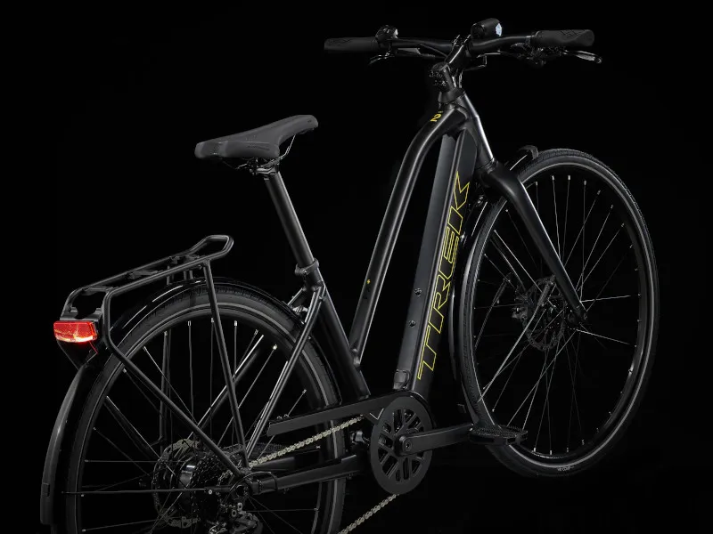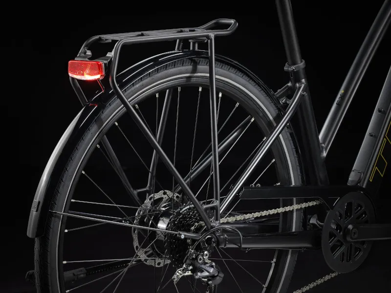 Lehký hliníkový rám se sníženou rámovou trubkou, díky které je nasednutí i sesednutí ještě snazší, patentovaný systém podpory šlapání Trek s motorem v náboji (250 W, 40 Nm), jenž poskytuje podporu až do rychlosti 25 km/h, a 250Wh baterie pro dojezd až 56 kilometrů na jedno nabití. Navíc rychlá kola 700c, rychlé a přitom stabilní pláště 40c s reflexními bočnicemi, spolehlivý 9rychlostní pohon Shimano, hydraulické kotoučové brzdy, integrovaná světla napájená z baterie, zadní nosič kompatibilní se systémem MIK, blatníky a stojánek.