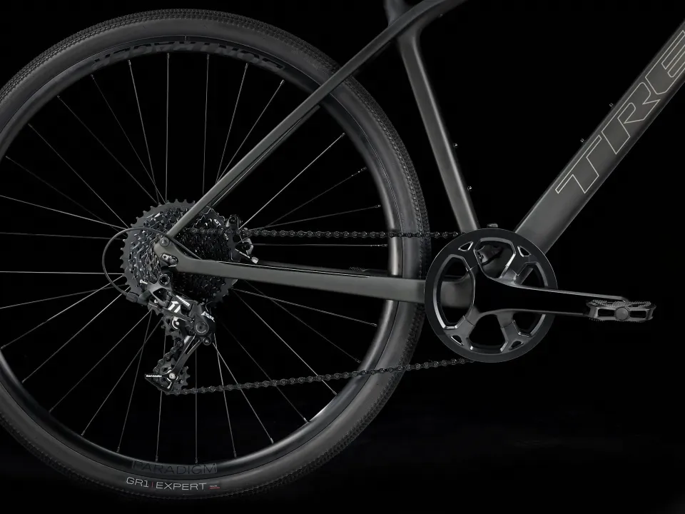 Lehký rám a vidlice z karbonu OCLV řady 400, pohon 1x SRAM Apex se širokým rozsahem převodů, hydraulické kotoučové brzdy, skryté úchyty na blatníky, lehká sada slitinových kol Bontrager Paradigm umožňující použití bezdušových plášťů, široké a rychlé gravelové pláště Bontrager GR1 Expert a řídítka s ergonomickými gripy tlumící vibrace.