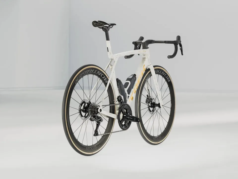 Neuvěřitelně lehký rám z našeho nejlepšího karbonu OCLV řady 900 s aerodynamicky tvarovanými trubkami a technologií IsoFlow zaručující pohodlí a aerodynamickými lahvemi a košíky RSL, které šetří watty. Špičková silniční sada Shimano Dura-Ace Di2 pro bleskově rychlé řazení, které si lze nastavit podle svého. Univerzální patka přehazovačky, takže lze náhradu sehnat kdekoli. Stroj doplňují bezdušová karbonová kola Bontrager Aeolus RSL 51 a jednodílná řídítka s představcem Trek Aero RSL.