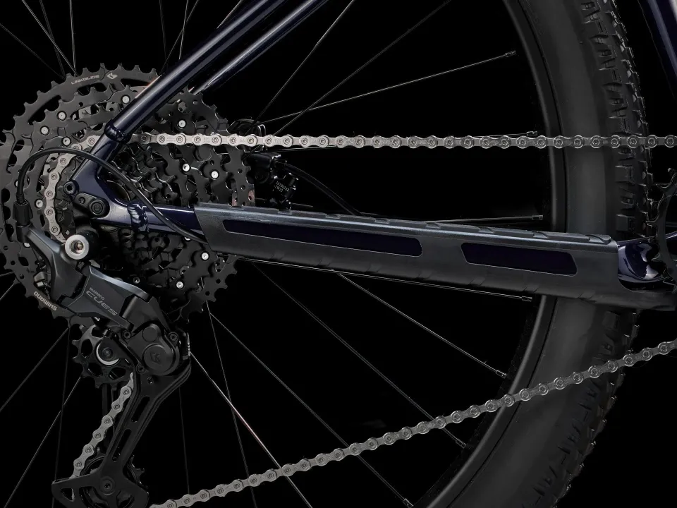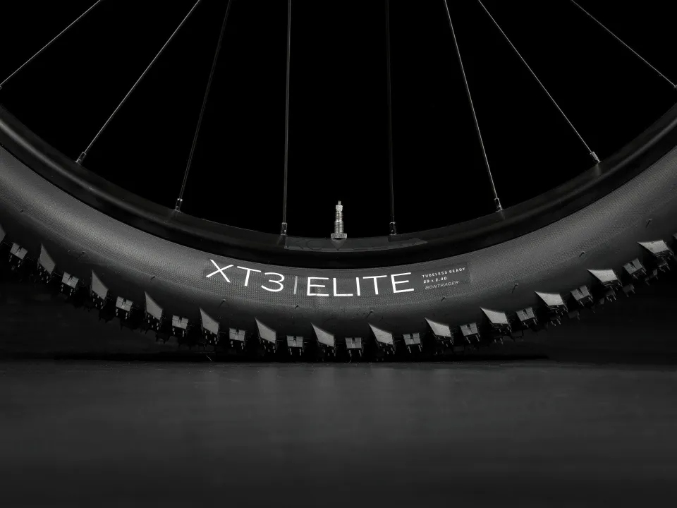 Bontrager XT3 Elite, možnost použití bezdušových plášťů, odolná vrstva Inner Strength, drátová patka, 60 tpi, 26 x 2,35 palce (XXS). Maxxis Ardent Race, bezdušový, ochrana EXO, skládací patka, 27,5 x 2,35 palce (XS, S), 29 x 2,35 palce (M, ML, L, XL, XXL)