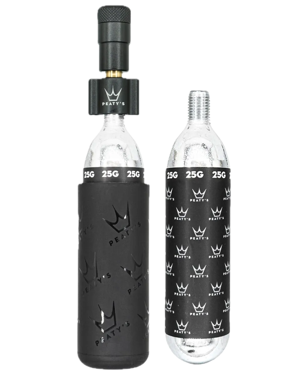 Spolehlivá a stylová CO₂ sada pro rychlé dohuštění bezdušových plášťů v terénu. Peaty’s Holeshot CO2 hlavice je vyrobena z precizně CNC obráběného hliníku 6061, má anodizovaný povrch a patentovaný tvar pro rychlou, přesnou a pohodlnou aplikaci. Použití je extrémně jednoduché – stačí hlavici nasadit na galuskový ventilek a stlačit. O zbytek se postará stlačený CO₂ plyn z 25g bombičky, který zvládne bez problémů nafouknout i širší MTB pláště.