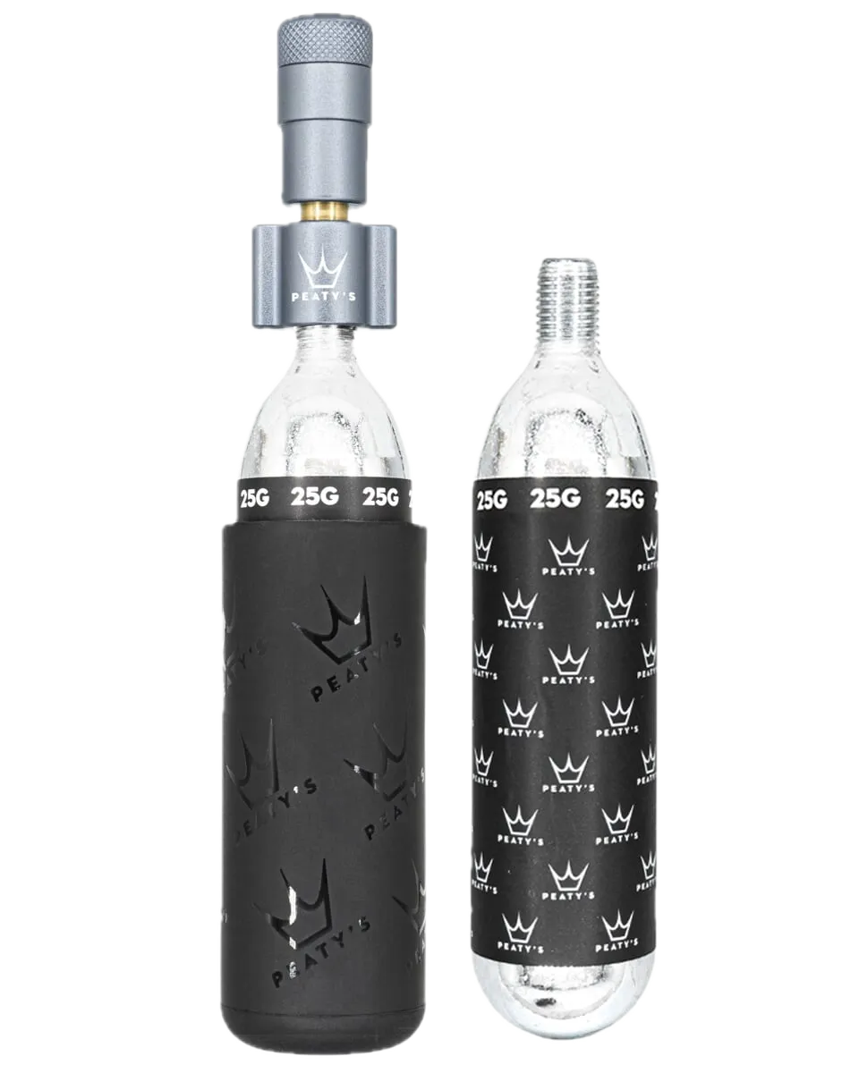 Spolehlivá a stylová CO₂ sada pro rychlé dohuštění bezdušových plášťů v terénu. Peaty’s Holeshot CO2 hlavice je vyrobena z precizně CNC obráběného hliníku 6061, má anodizovaný povrch a patentovaný tvar pro rychlou, přesnou a pohodlnou aplikaci. Použití je extrémně jednoduché – stačí hlavici nasadit na galuskový ventilek a stlačit. O zbytek se postará stlačený CO₂ plyn z 25g bombičky, který zvládne bez problémů nafouknout i širší MTB pláště.
