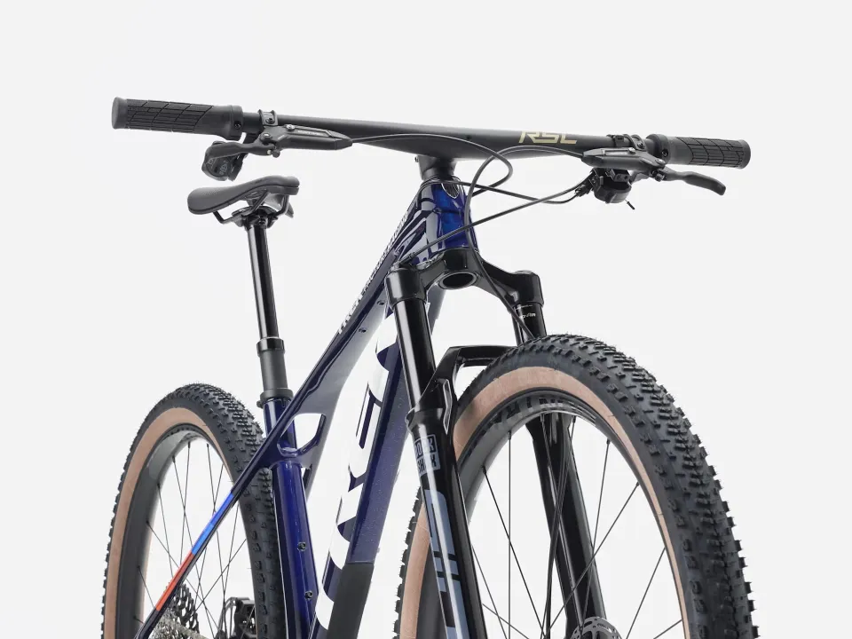 Karbonový rám OCLV Mountain s technologií IsoBow pro vyhlazování nerovností trailů. Vidlice RockShox SID se zdvihem 120 mm, pružina DebonAir, tlumení Rush RL a dálkové zamykání. Zcela bezdrátové 12rychlostní elektronické řazení SRAM GX AXS, 4pístkové hydraulické kotoučové brzdy SRAM Level Bronze, 29palcová karbonová kola Bontrager Kovee Elite 30 a integrovaná řídítka a představec Bontrager RSL z karbonu.