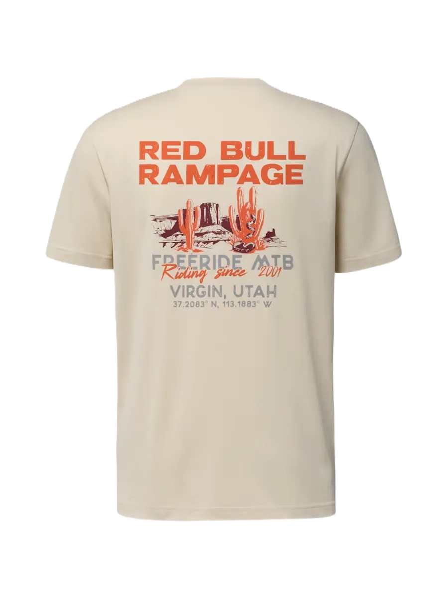 Na hrudi je decentně umístěno logo Red Bull Rampage, zatímco na zádech dominuje potisk jezdců inspirovaný ikonickou lokalitou závodu v Utahu. Díky 100% bavlně je triko příjemné na nošení a vhodné pro každodenní použití.