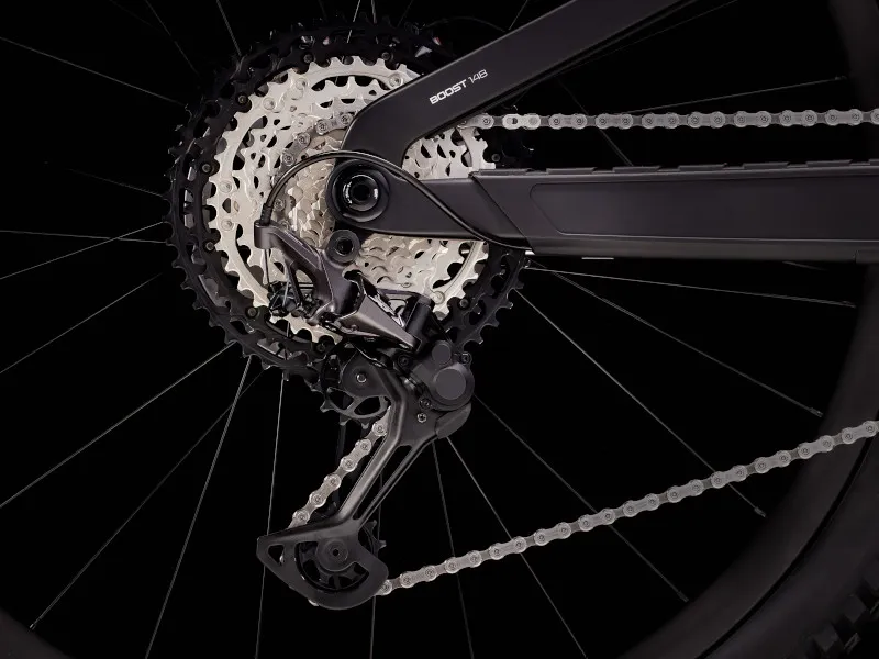 Zadní kolo: Bontrager Line Elite 30, karbon OCLV Mountain, možnost použití bezdušových plášťů, Rapid Drive 108, 6 šroubů, ořech Freehub Shimano MicroSpline, Boost148, 12mm pevná osa