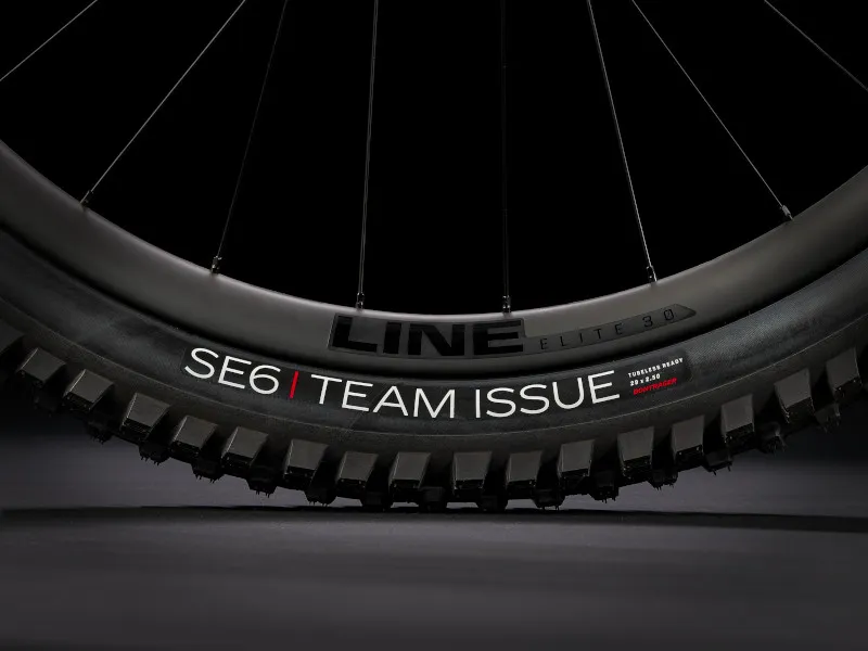 Plášť: Bontrager SE5 Team Issue, umožňující použití bezdušových plášťů, bočnice Core Strength, aramidová patka, 120 tpi, 29 x 2,50 palce.