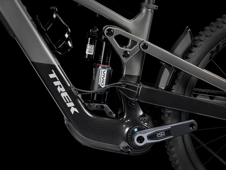 Rám z karbonu OCLV pro horská kola s odpružením s vysoko umístěným čepem a tichým, ale výkonným motorem TQ HPR50 (50 Nm, 250 W) s 580Wh baterií. 170mm zdvih vpředu i vzadu díky vidlici RockShox ZEB Ultimate Deluxe s pružinou DebonAir a tlumením Charger 3.1 a tlumičem RockShox Vivid Ultimate. Kola Bontrager Line Pro 30 z karbonu OCLV pro horská kola (29palcové přední/27,5palcové zadní) pro hladký přejezd náročného terénu, teleskopická sedlovka RockShox Reverb, 4pístkové brzdy SRAM Maven Silver a bezdrátové elektronické řazení SRAM X0 AXS transmission direct mount.