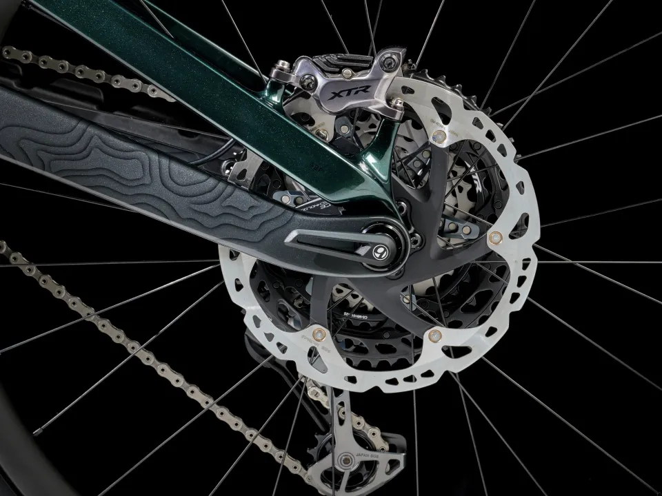 Komponenty Sedlo:Bontrager Arvada, austenitové ližiny, šířka 138 mm. Sedlovka:Velikost: S- Teleskopická sedlovka Bontrager Line Elite, zdvih 100 mm, MaxFlow, vnitřní vedení, 34,9 mm, délka 345 mm, Velikost: M, ML- Teleskopická sedlovka Bontrager Line Elite, zdvih 170 mm, MaxFlow, vnitřní vedení, 34,9 mm, délka 485 mm, Velikost: L, XL- Teleskopická sedlovka Bontrager Line Elite, zdvih 200 mm, MaxFlow, vnitřní vedení, 34,9 mm, délka 550 mm. Integrovaná řídítka/představec: Bontrager RSL, karbon OCLV, prohnutí řídítek 27,5 mm, šířka 820 mm, 0stupňový sklon představce, délka představce 35 mm. Gripy:Bontrager XR Trail Pro, slitina, zamykání Lock-On. Hlavové složení: Integrované ložisko, horní 1-1/8 palce, spodní 1,5 palce, možnost nastavení úhlu. Brzda:Shimano XTR M9120, čtyřpístkové hydraulické kotoučové. Brzdový rotor: Shimano RT86, 6 děr, 203 mm. Rozměry kotouče: Maximální velikosti kotoučů - Rám: 220 mm.