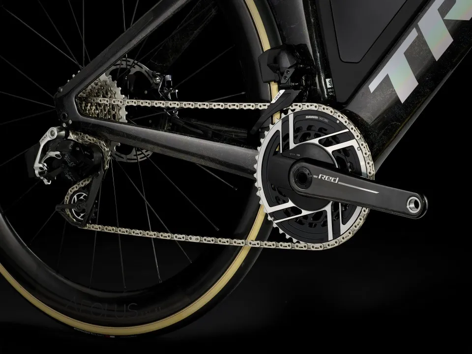 Lehoučký rám z karbonu OCLV řady 800, aerodynamicky tvarované trubky Kammtail Virtual Foil (KVF) snižující odpor vzduchu, celokarbonová vidlice Speed Concept, nerovnosti tlumící prvek IsoSpeed, integrovaný úložný prostor na výživu, hydrataci a sadu na opravu defektu, 12rychlostní bezdrátový elektronický pohon SRAM RED AXS s tlačítky SRAM AXS Blips, wattmetr RED AXS, plně integrovaná řídítka a představec, karbonové sedlo Bontrager Hilo Pro na triatlon s agresivní aerodynamickou pozicí, spolehlivé kotoučové brzdy a aerodynamická kola Bontrager Aeolus RSL 51 z karbonu OCLV.